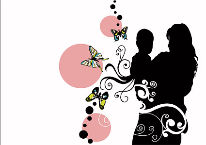 Description:Mother and child silhouette, butterflies, flowers, vector material