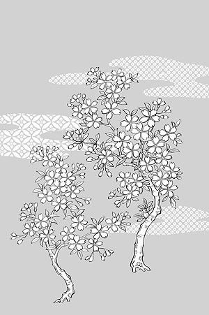 Description:Japanese line drawing of plant material -25 Vector flowers (cherry blossoms, clouds, back)