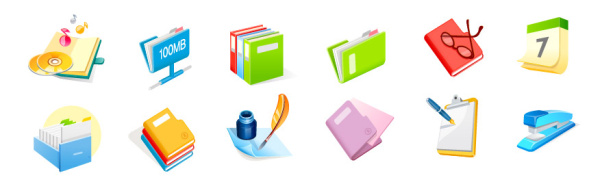 Description:Folders, notebooks, CD, brush, stapler, etc. Vector Icons